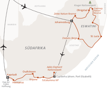 <Heute fahren wir tief hinein in den Kruger Nationalpark, Südafrikas größten Wildschutzgebiet. Vom offenen Geländewagen beobachten wir den ganzen Tage die vielfältige Tierwelt – von den majestätischen „Big Five“ (Elefant, Nashorn, Löwe, Büffel und Leopard) bis hin zu zahllosen anderen Säugetieren und Vögeln. Immer wieder halten wir inne, um die Weite und Ruhe der endlosen Buschlandschaft auf uns wirken zu lassen. Am Nachmittag begeben wir uns auf eine Fußpirsch im Guernsey Wildreservat, um die kleinen Wunder der Natur zu entdecken. Unser Guide zeigt uns, wie man Spuren liest, erklärt die Besonderheiten der Pflanzen und stellt die verschiedenen Vogelarten vor. Mit etwas Glück begegnen wir auch größerem Wild, das zum Sonnenuntergang wieder lebhafter wird und die Savanne durchstreift.