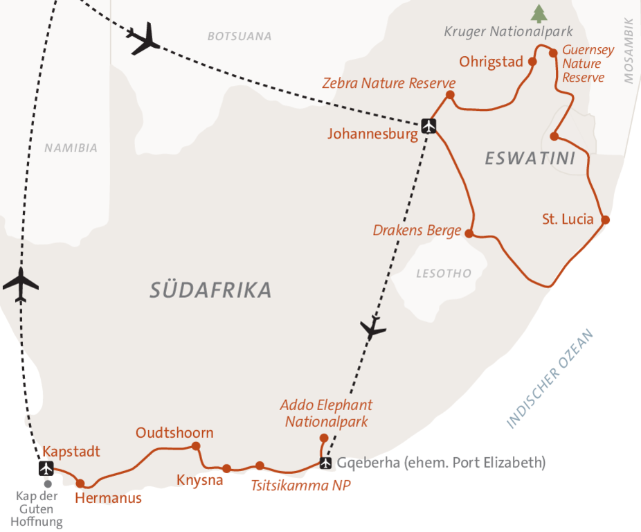 Neuer Reiseverlauf 2026: Unvergessliche Tierbeobachtungen, grandiose Canyons, riesige Naturparks, spektakuläre Küsten, die gigantischen Drakensberge, liebliche Weinbauregionen und natürlich Kapstadt – auf dieser Reise erleben wir die komplette Vielfalt eines Kontinents. Wir wandern durch einzigartige Landschaften, übernachten in charmanten Hotels und Gästefarmen sowie in einer stilvollen Lodge in einem privaten Wildreservat und verkosten Wein in Stellenbosch. Wir erleben multikulturelles Leben in den Städten und ein Naturparadies, das vielfältiger nicht sein könnte.