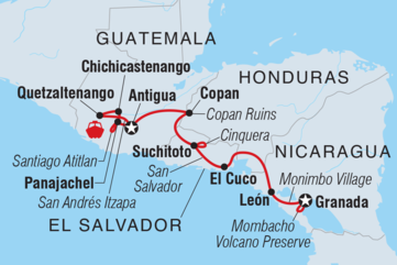 Begib dich auf einen wilden Ritt durch das Herz Mittelamerikas - ein Ort mit vielfältiger Kultur, Maya-Zivilisationen und modernen Religionen. Beginne deine 15-tägige Reise am Nicaraguasee, umgeben von aktiven Vulkanen. Besuche den Vulkan Mombacho, fahre durch den Nebelwald zum Gipfel des Kratersees und erkunde dann die Stadt Leon in deinem eigenen Tempo. Triff einen ehemaligen Guerillero in der Gemeinde Cinquera, während du die kleine Stadt besichtigst, und beobachte anschließend die Vögel in El Salvador. In einem Kochkurs lernst du einige lokale Spezialitäten zuzubereiten und erkundest die Ruinen von Copan, die zum UNESCO-Weltkulturerbe gehören. Besuche die Märkte im guatemaltekischen Hochland und fahre in einem traditionellen Hühnerbus - der Stolz vieler Einheimischer in Quetzaltenango. Erfahre mehr über die Geschichte und die Anziehungskraft der Gottheit San Simon und entdecke die versteckten Juwelen in Antigua, bevor du eine malerische Bootsfahrt auf dem Atitlan-See unternimmst.