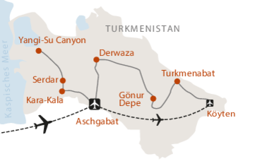 Am Nachmittag oder Abend Flug Richtung Turkmenistan. Ankunft am frühen Morgen des nächsten Tages.