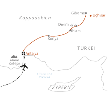 Im Herzen Anatoliens liegt die zu Stein gewordene Wunderwelt Kappadokien – eine Landschaft wie aus einem Traum geformt: konische Felsformationen, enge Schluchten, phantasievolle Türme und tiefe Höhlen. Im Grunde genommen wandern wir auf dem Boden eines großen Sees, dessen Wasser vor Tausenden von Jahren abfloss. Hier haben Menschen Höhlenwohnungen, Vorratskammern und Kirchen gebaut. Besonders beeindruckend ist die unterirdische Stadt Derinkuyu, die mehrere Stockwerke tief in den Boden gegraben wurde. Wir tauchen ein in diese Wunderwelt – Eindrücke, die wir nie vergessen werden!
