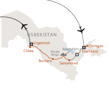 Usbekistan, im Herzen Mittelasiens gelegen, ist ein Land voll faszinierender Kontraste. Die imposante Gebirgswelt des Tien-Shan und die urwüchsigen, kargen Nurata Berge bilden eine beeindruckende Kulisse für unsere Wanderungen. Die Städte Chiwa, Buchara und Samarkand lassen jene Zeit lebendig werden, in der einst Karawanen auf der legendären Seidenstraße von China bis nach Europa gezogen sind. Kunstvoll verzierte Moscheen und Medresen mit leuchtend blauen Kuppeln und mächtigen Minaretten prägen das Bild. Wir fühlen uns wie in einem Märchen aus 1000 und einer Nacht.