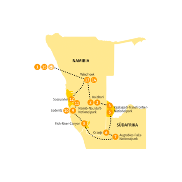 - 12 Übernachtungen in Lodges, in einem Hotel und in einem Nationalpark-Camp im Kgalagadi-Transfrontier-NP