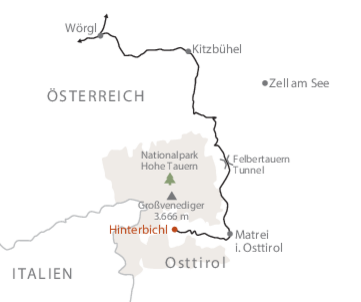 PKW (Vignette/Maut): Autobahn München – Innsbruck – Ausfahrt Kufstein/Süd – Kitzbühel – Pass Thurn – Mittersill – Felbertauern-Tunnel – Matrei in Osttirol – Virgental – Prägraten – Hinterbichl; kostenlose Parkmöglichkeit beim Gasthof;