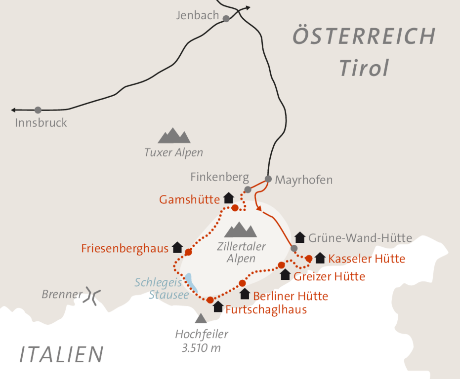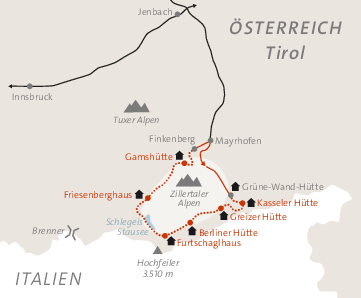 <In Mayrhofen werden wir am frühen Nachmittag von unserem ASI-Bergführer begrüßt und starten gemeinsam in die Trekkingwoche. Mit dem Taxi fahren wir zur Grüne-Wand-Hütte, wo unsere erste Etappe beginnt. Von dort steigen wir über einen aussichtsreichen Bergweg zur gemütlichen Kasseler Hütte (2.178 m) auf, die beeindruckend über dem Stilluptal thront und unser Quartier für die erste Nacht ist.