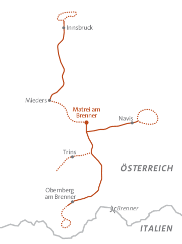 Bis Bahnhof Matrei am Brenner. Weiter zu Fuß (Gehzeit ca. 25 min), mit Taxi (Fahrzeit 5 min, Bestellung bei ASI) oder mit dem Mühxi-Bus (Abfahrt 16:08 und 17:25 Uhr) zur Unterkunft.