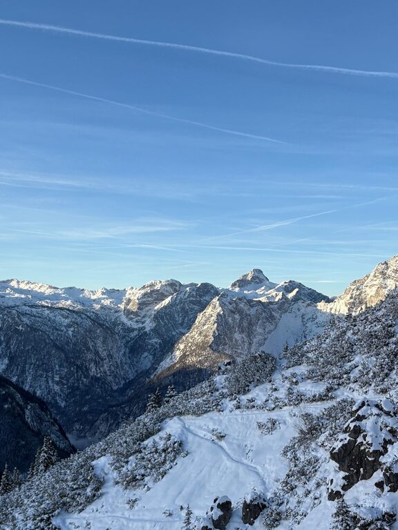 <Nach dem Frühstück machen wir uns auf den Weg zum Hausberg der Hütte, den Schneibstein. Zuerst noch flach wird der Anstieg schon bald steiler. Wir halten uns links bis wir wieder auf flacheres Gelände treffen. In großen Spitzkehren wandern wir den breiten Grat zum Gipfelplateau hinauf. Oben angekommen werden wir mit einer unvergesslichen Aussicht belohnt. Wir blicken in die Weiten des unberührten Hagengebirges oder hinüber zum Watzmann mit seiner Ostwand. Zurück geht es über den Aufstiegsweg, am Schneibsteinhaus angekommen stärken wir uns für unsere Silvesternacht.