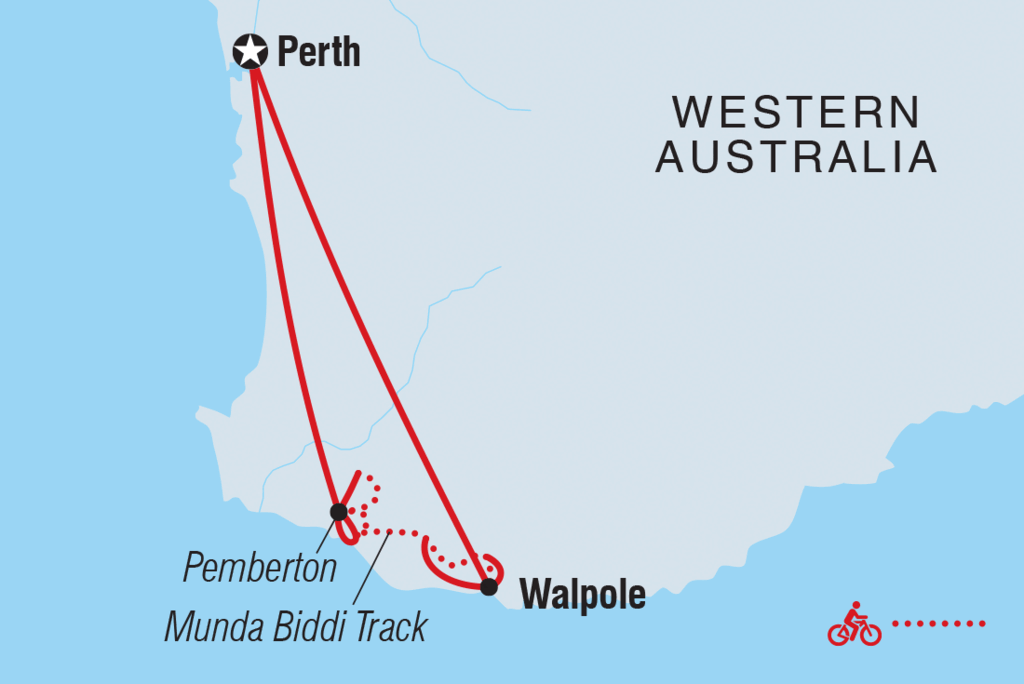 Fahre den längsten Off-Road-Radweg der Welt. Von Walpole nach Manjimup führt dich diese sorgfältig ausgearbeitete Reise entlang eines atemberaubenden Abschnitts des weltberühmten Munda Biddi Trails. Bei einer Strecke von etwa 40 km pro Tag hast du die Möglichkeit, in die ruhigen Landschaften der Karri und Jarrah Wälder, Flüsse und Täler einzutauchen. Jeden Abend wirst du in den charmanten Unterkünften in den Städten, die der Weg durchquert, willkommen geheißen. Mit einem speziellen Begleitfahrzeug kannst du dein Raderlebnis in Westaustralien genießen, während du dich um deine Mahlzeiten, deine Unterkunft und dein Gepäck kümmerst.
