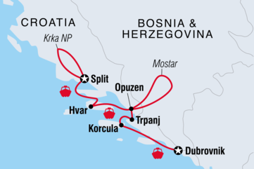 Stell dir vor, wie die Sonne dich wärmt, während du dich über die Bordwand eines Bootes lehnst und in aller Ruhe das klare Wasser beobachtest, das an die Kalksteinklippen und die kieseligen Küsten Kroatiens schwappt. Diese achttägige Kreuzfahrt mit einem kleinen Schiff bietet viel von dieser Entspannung, unterbrochen von aufregenden Aktivitäten wie einer Flussfahrt und einer Wanderung zu den Wasserfällen des Krka-Nationalparks. Nimm an Ausflügen wie einer Weinkellertour in der Nähe von Korcula teil und erkunde die dalmatinische Küste mit einem örtlichen Reiseleiter und einer Gruppe gleichgesinnter Reisender.