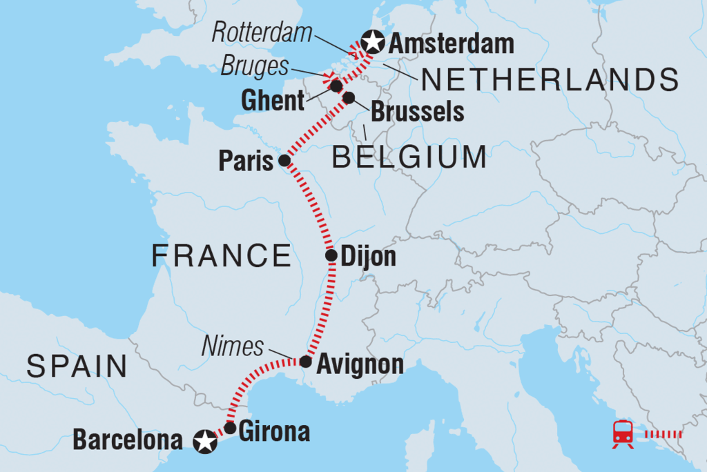 Besuche einige der besten Städte Europas auf einer 15-tägigen Reise von Barcelona nach Amsterdam, die viel Spaß, Flexibilität und freie Zeit bietet, um jedes Ziel in deinem eigenen Tempo zu erkunden. Begleite deinen örtlichen Reiseleiter auf Orientierungsspaziergängen, schlendere durch die Straßen von Dijon und sieh dir die Architektur von Gaudi in Barcelona an. Erkunde die mittelalterlichen Mauern von Girona, lerne die Geschichte der Gladiatoren im römischen Amphitheater von Nimes kennen und besuche den größten Seehafen Europas in Rotterdam. Diese Reise bietet ein ausgewogenes Verhältnis zwischen Freizeit und kuratierten, lokalen Erlebnissen, die einen tiefen Einblick in die Geschichte Westeuropas geben.