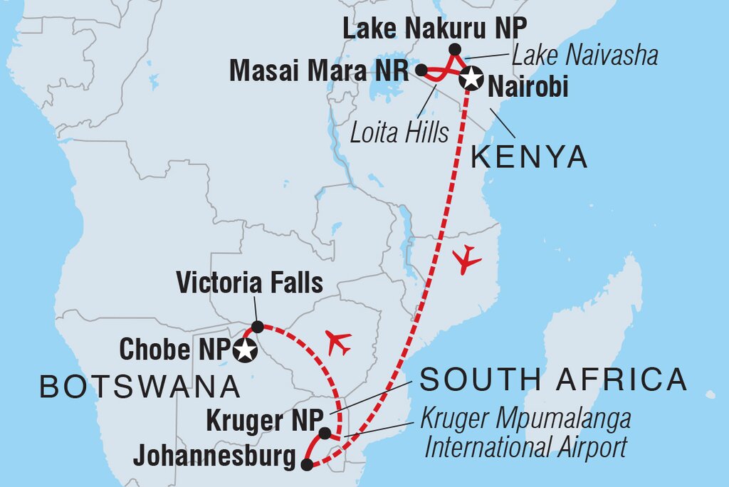 Auf dieser 15-tägigen Premiumreise erlebst du die Wunder Kenias, Südafrikas, Simbabwes und Botswanas aus der ersten Reihe. Von Nairobi aus fährst du zu den Seen Naivasha und Nakuru und entdeckst dann die Tierwelt und die Landschaften der Maasai Mara in Landcruisern mit Vierradantrieb. Triff Maasai-Krieger und erfahre mehr über ihre Lebensweise bei einem Besuch in einem traditionellen Dorf. Verbringe zwei unvergessliche Tage in der Greater Kruger Region, fahre bei Sonnenuntergang den Sambesi hinunter, bestaune die atemberaubenden Viktoriafälle und halte Ausschau nach einer Vielzahl von Elefanten im Chobe National Park. Von aufregenden Pirschfahrten bis hin zu Nächten unter dem Sternenhimmel - dieses spektakuläre Stück Afrika wird dich mit Sicherheit in Staunen versetzen.