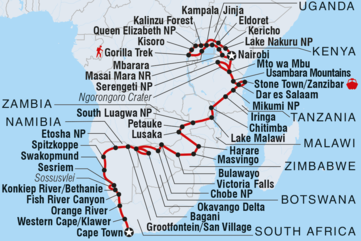 Auf der Suche nach Afrika mit allem Drum und Dran? Frag und du bekommst es auf dieser epischen Reise durch zehn Länder in 63 unvergesslichen Tagen. Komme atemberaubend nah an Tiere heran, die du sonst eher in Zoos und Naturdokumentationen siehst, von bedrohten Berggorillas und schwerfälligen Elefanten bis hin zu wilden Löwen und winzigen Dikdik-Antilopen. Unterwegs triffst du Menschen aus verschiedenen Kulturen und Gemeinschaften: Gewürzbauern aus Sansibar, Fischer aus dem Malawisee und die San. Von Nairobi bis Kapstadt und all den Abenteuern dazwischen - diese Reise wird dich von der Vielfalt des Lebens, der Kultur und der Schönheit der Natur auf diesem spektakulären Kontinent beeindrucken.