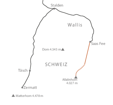 <Mit der Metro-Alpin erreichen wir den Startpunkt für den ersten Viertausender. Von der Station Mittelallalin in 3.500 m Höhe ist der Anstieg bis zum Gipfel nicht mehr weit. So haben wir Gelegenheit, unterwegs auf Tour noch einmal das Gelernte anzuwenden ohne in der dünnen Luft außer Atem zu kommen. Vom Gipfel geht es zurück zur Station am Mittalallalin und mit der Bahn hinunter nach Saas Fee.