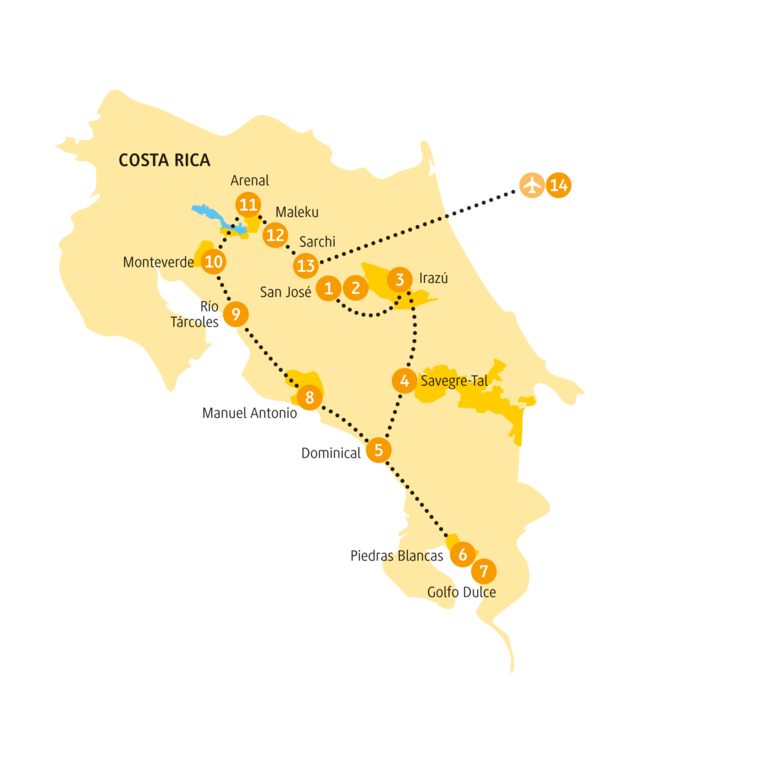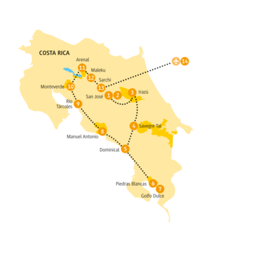 <Dein Abenteuer in Costa Rica beginnt! Du fliegst nach San José, in die Hauptstadt. Deine Reiseleitung erwartet dich am Flughafen. Danach geht es ins Hotel, dort kannst du dich nach einem kleinen Snack vom Flug erholen.