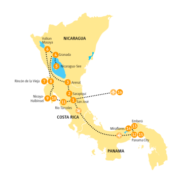 Es ist, als müssten Adam und Eva jeden Moment um die Ecke kommen. Hier, wo die Natur noch tun und lassen darf, was sie will. In den Nationalparks Manuel-Antonio, Arenal und Caño Negro. Aber bevor du einen Grünkoller bekommst, servieren wir dir die 365 Inseln im tiefblauen Nicaragua-See, den als Höllenschlund verdammten Vulkan Masaya und eine Portion Balsam für die Seele: Panama.