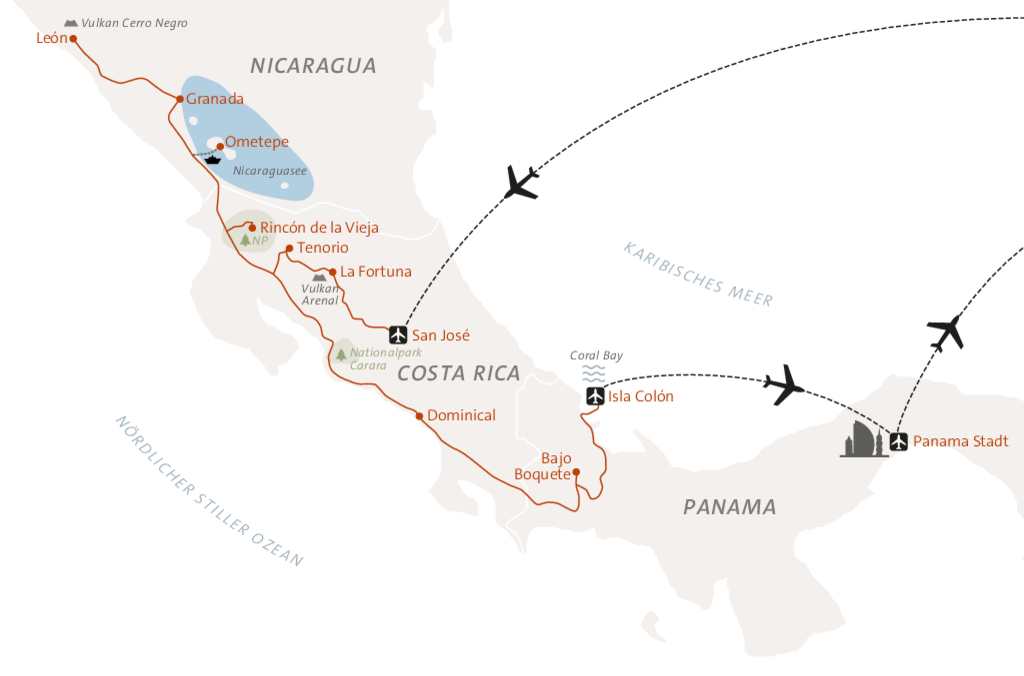 - Grenzübertrittsgebühren auf dem Landweg (unterliegt kurzfristigen Änderungen): Costa Rica pro Strecke 2,- USD, Nicaragua pro Strecke 3 USD & Touristenkarte 10 USD, Panama pro Strecke 4 USD