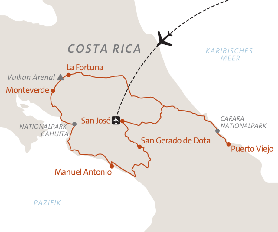 Pura Vida - wörtlich übersetzt "pures Leben" ist eine oft verwendete Redewendung der Ticos. Wer durch das kleine Land zwischen den Ozeanen reist, weiß auch schnell warum. Dichte Regenwälder, unberührte Küstenlandschaften, mächtige Vulkane und eine artenreiche Tier- und Pflanzenwelt erwarten den Besucher und vermitteln gepaart mit der Lebensfreude der Einheimischen, dieses Pura Vida auf Schritt und Tritt. Wir wandern durch die schönsten Naturreservate des Landes, lauschen den Stimmen des Dschungels, beobachten exotische Tiere und baden an den schönsten Stränden am Atlantik und Pazifik.