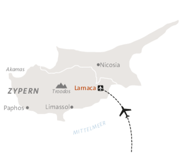 Flug nach Larnaca / Zypern. Am Flughafen wirst du von einem ASI Vertreter abgeholt und in das Hotel gefahren. Bitte achte auf das ASI-Willkommensschild mit unserem Logo als Erkennungszeichen.