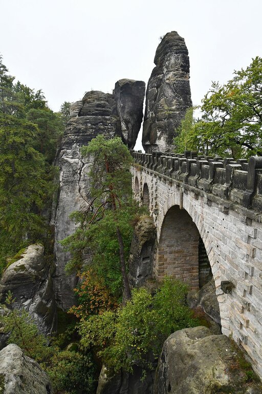 <Wanderung zum Steinernen Tisch. Anlässlich einer Jagd ließ hier August der Starke im Jahre 1710 einen steinernen Tisch errichten, um an dieser markanten Wegkreuzung ein kurfürstliches Essen abhalten zu können. Weiter führt die Wanderung in Richtung der bekannten Bastei. Diese noch bis heute bestehende Sandsteinbrücke, erbaut 1851, erstreckt sich auf einer Länge von 76,5m über die Mardertelle. Wir genießen das schöne Panorama hoch über der Elbe und gehen über Schwedenlöcher und Amselsee nach Rathen.