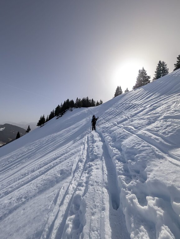 <Heute führt uns die Route zum Riedberger Horn, einem der höchsten Gipfel der Region. Der Weg bietet beeindruckende Ausblicke und führt über sanfte Hänge und freie Flächen. Am Abend erwartet uns ein gemütliches Beisammensein in der Hütte.