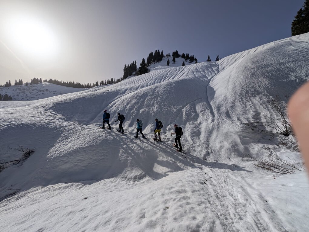 <Nach dem Frühstück schnallen wir ein letztes Mal die Schneeschuhe an und wandern zurück zur Talstation. Dort verabschieden wir uns gegen 14:00 Uhr und treten die individuelle Heimreise an.