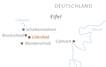 Am Anreisetag um 18:00 Uhr im Landhotel Gillenfelder Hof ***S, Am Markt 1, 54558 Gillenfeld, Telefon +49-6573-99250. Bei unerwarteter Verspätung bitten wir dich, über diese Telefonnummer mit dem ASI-Bergwanderführer Kontakt aufzunehmen.