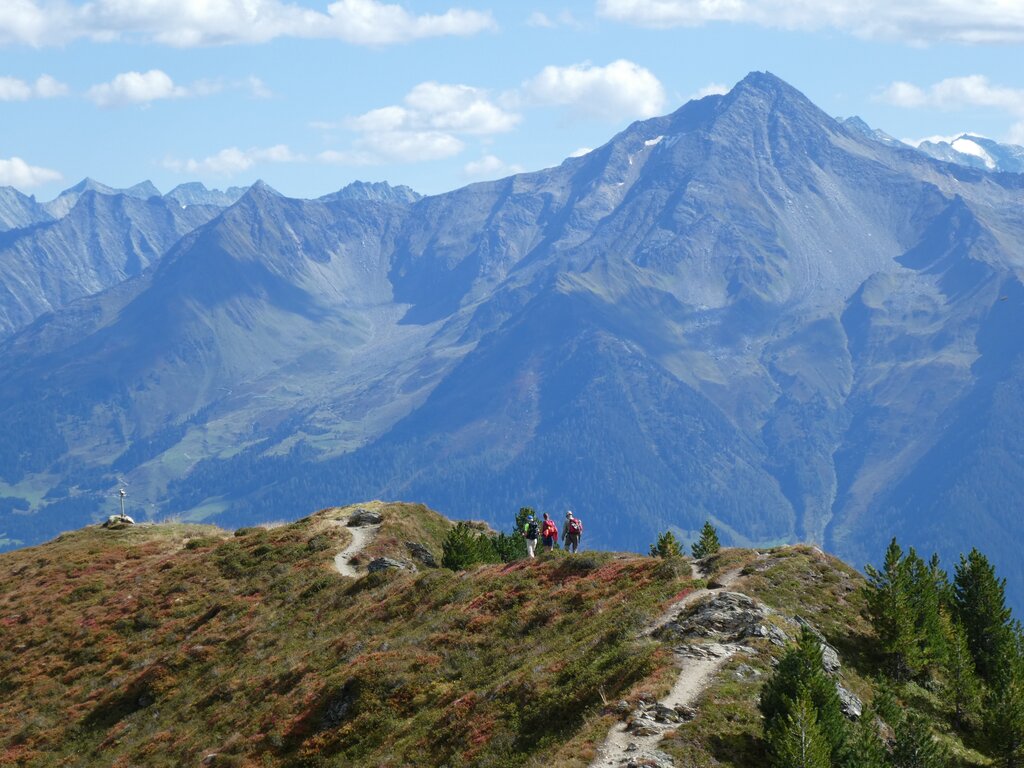 <Zu Beginn der Tour geht es durch urige Almdörfer, deren Geschichte eng mit dem Zillertal verbunden sind. Auf alten Viehwegen wandern wir vorbei an glattpolierten Felsplatten, die der einstige Gletscher geformt hat. Der Anstieg führt stetig, aber angenehm auf das Sidanjoch, wo sich der Blick weit über die Bergwelt öffnet. Nur wenige Minuten entfernt liegt die Rastkogelhütte – ein idealer Platz, um einzukehren und das Panorama zu genießen. Anschließend folgt der Aufstieg zum Mitterwandskopf, bevor der Weg in ein besonders reizvolles Wegstück übergeht: Ein schmaler Steig vorbei an kleinen Lacken, Überbleibseln der Eiszeit, und führt schließlich über den Rauhenkopf hinüber zum Melchboden an derm Zillertaler Höhenstraße, von wo aus wir mit dem öffentlichen Bus zu unserem heutigen Ziel nach Mayrhofen fahren.