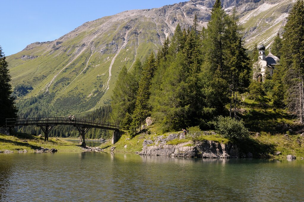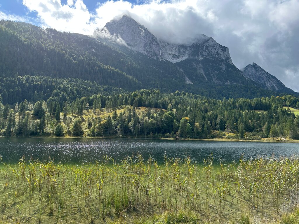 <Wir fahren mit der Gondelbahn hinauf zum Eckbauer (1.250 m) und starten unsere erste Wanderung vorbei an Schloss Elmau zum idyllisch gelegenen Lautersee. An der Ederkanzel, einem beliebten Ausflugsgasthaus, überschreiten wir die Grenze nach Tirol und steigen hinab ins malerische Leutaschtal – ein perfekter Auftakt für unsere Alpenüberquerung.