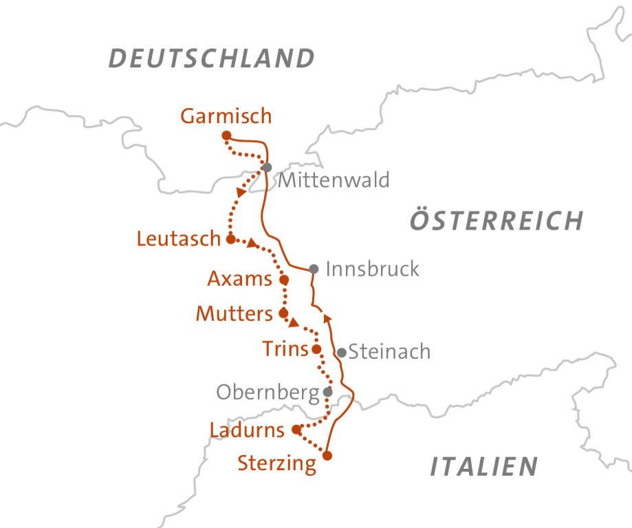 Wir starten im Werdenfelser Land, wo uns die beeindruckende Bergkulisse von Garmisch-Partenkirchen begrüßt – die Gipfel, die wir in den kommenden Tagen überqueren werden. Nach der Auffahrt mit der Eckbauerbahn wandern wir Richtung Mittenwald, ehe wir Bayern hinter uns lassen und Tirol erreichen. Durch den Alpenpark Karwendel geht es weiter ins Inntal, bevor wir in den Stubaier Alpen den Alpenhauptkamm überschreiten und schließlich in Südtirol ankommen. In Sterzing erwarten uns prächtige Bürgerhäuser, malerische Einkaufsstraßen und mittelalterliche Plätze – ein stimmungsvoller Abschluss unserer Alpenüberquerung.