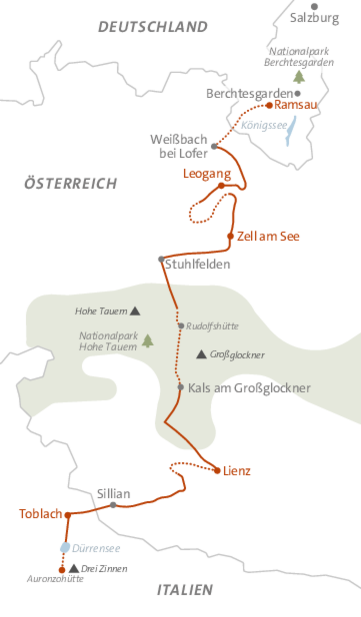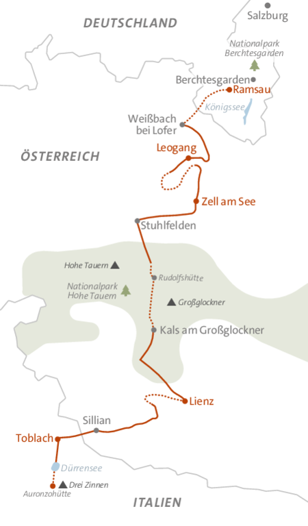 Vom Nationalpark Berchtesgaden über die Hohen Tauern bis in den Naturpark Drei Zinnen – diese Alpenüberquerung steckt voller Abwechslung und bietet immer neue Perspektiven auf die Schönheit der Alpen. Auf Höhenwegen und bei eindrucksvollen Überschreitungen wandern wir Schritt für Schritt gen Süden. Ein besonderes Erlebnis ist die Übernachtung auf 2.300 Metern im Berghotel Rudolfshütte, wo der klare Sternenhimmel zum Greifen nah scheint. Mit dieser komfortablen Variante des Klassikers „Königssee – Drei Zinnen“ verbinden wir das intensive Erlebnis einer Trekkingreise mit den Annehmlichkeiten von Gepäcktransport sowie sorgfältig ausgewählten Hotels und Gasthöfen. So starten wir jeden Morgen erholt in einen neuen Tag am Berg.