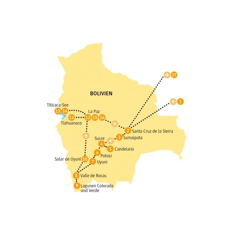 - Regionalflüge von Santa Cruz nach Sucre, von Uyuni nach La Paz und von La Paz nach Santa Cruz