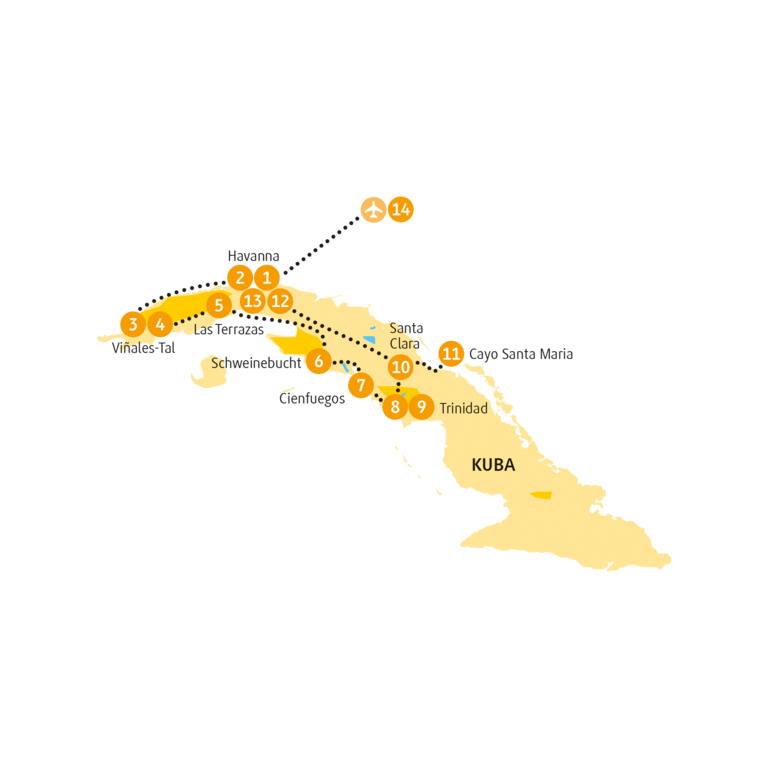 <Jubel! Der Flieger nach Kuba hebt heute ab und das Abenteuer beginnt mit einem Umstieg in Madrid. Aber dann landest du in Havanna, wo deine Reiseleitung dich herzlich in Empfang nimmt und sich sogleich fürsorglich um den raschen Transfer zum Hotel kümmert. -