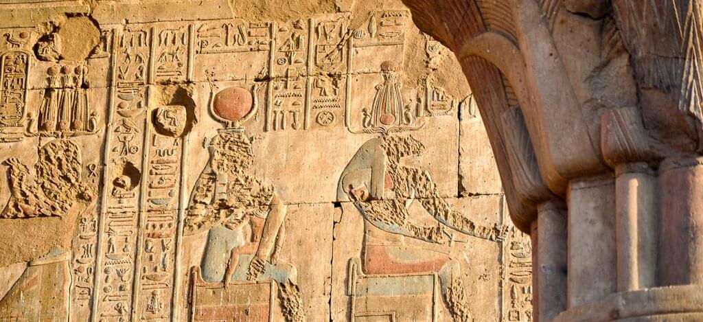 <Genieße einen entspannten Vormittag an Deck und beobachte das Leben entlang des Nilufers. Lies ein Buch oder genieße einfach nur den Moment. Früher oder später – je nachdem, wie gnädig der Wind uns heute gesonnen ist – kommst du nach el-Kab und legst hier für einen kleinen Zwischenstopp an. Die antike Stadt el-Kab – oder auch Necheb – zählte einst zu den größten Städten des Alten Ägyptens und war der Schutzgöttin Nechbet gewidmet. Noch heute sind einige Abschnitte der bis zu elf Meter dicken Lehmziegelmauer, die die Stadt umrundete, sichtbar. Etwas außerhalb der Mauer liegt eine Nekropole mit 31 Felsengräbern, die teilweise mit gut erhaltenen farbigen Reliefs dekoriert sind. Ein Stückchen weiter flussaufwärts kommst du zum Horus-Tempel in Edfu, der dem gleichnamigen Himmelsgott gewidmet ist. Dieser gehört zu den besterhaltenen Tempeln im ganzen Land, und das, obwohl er schon rund 2.000 Jahre alt ist. Horus wird in der ägyptischen Mythologie unter anderem als Falke dargestellt. Es ist also nicht überraschend, dass dich der mächtige Eingangspylon, der in der Breite fast 70 Meter misst, mit zwei überlebensgroßen Falkenstatuen begrüßt. Der Legende nach kämpfte Horus gegen seinen Onkel Seth, mit dem er um die rechtmäßige Thronfolge stritt. Wie der Kampf ausging, verraten dir die Hieroglyphen im Inneren des Tempels, die bis zu ihrer Freilegung im Jahre 1860 zur Hälfte im Wüstensand verborgen lagen. -