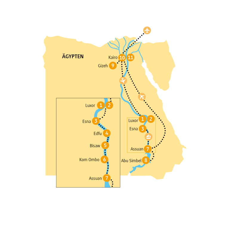 - Inlandsflüge mit Egypt Air von Kairo nach Luxor und von Assuan nach Kairo