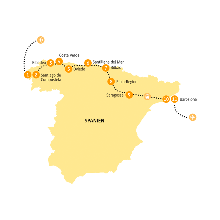 <Oviedo ist die Hauptstadt des ersten christlichen Königreichs der Iberischen Halbinsel und heutzutage Hauptstadt des Fürstentums Asturien. Sie gilt als politisches, wirtschaftliches und kulturelles Zentrum der autonomen Region. Und nicht nur das. Sie ist auch Ursprung des Jakobswegs, denn hier befindet sich der 0-km-Punkt der Jakobsroute. Wir stürzen uns zunächst auf die kulturellen Besonderheiten und besuchen die Kathedrale, in der kostbare Reliquien aufbewahrt werden. Dann wird es Zeit, eine typische Sidrería zu besuchen. In der Apfelweinstube erfahren wir alles Wissenswerte über das leckere Getränk. Nach der Verköstigung kommt dann wahrscheinlich auch schon langsam etwas Appetit auf. Kein Problem! Im eineinhalb Stunden entfernten Arenas de Cabrales haben wir eine kleine Käseprobe samt Tour durch die Käserei für dich eingeplant. Im Herzen der Picos de Europa wird laut Meinung vieler der beste Käse Spaniens produziert. Nur zu: Bilde dir selbst ein Urteil! Sobald du ausreichend Energie getankt hast, brechen wir auf zu unserem heutigen Übernachtungsort nahe Santillana del Mar. Am Abend ist Zeit für die Erkundung der Altstadt. Hier sticht vor allem die Stiftskirche aus dem 12. Jahrhundert hervor, verdient nicht weniger Aufmerksamkeit. -