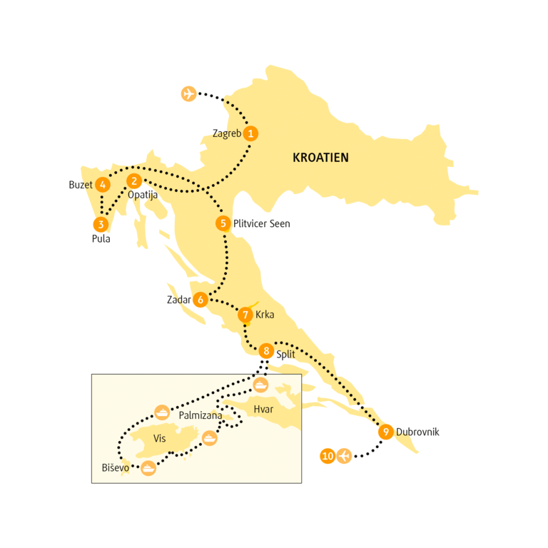 <Deine Reiseleitung erwartet dich bereits voller Spannung in der Hotellobby. Auf einem gemeinsamen Streifzug durch die historische Oberstadt von Zagreb gelangst du früher oder später an den Ban-Jelacic-Platz, dem zentralsten Ort der Stadt, und wirfst einen Blick auf die prächtige Kathedrale. Du kommst vorbei am Nationaltheater und siehst den Parlaments- und Regierungssitz Kroatiens. Der Dolac-Markt, auch "Bauch von Zagreb" genannt, ist wegen seiner großen roten Schirme kaum zu übersehen. Der Markt versprüht eine gewisse Nostalgie, weil er eine so lange Geschichte hat und das Leben in Zagreb seit Jahrzehnten prägt. Dein heutiges Ziel ist Opatija an der Kvarner-Bucht. Seit ein Kaufmann 1844 die Villa Angiolina samt einem exotisch bepflanzten Park errichtete, entdeckten auch Mitglieder der österreichischen Kaiserfamilie die klimatischen und gesellschaftlichen Vorteile dieses schönen Fleckchens. Der Aufschwung des Städtchens nahm damals geradezu atemberaubende Ausmaße an. Aus dieser Zeit stammen auch sehr viele Residenzen und Villen, die bis heute erhalten werden konnten, oft als Hotels und Pensionen umfunktioniert. Auf einem Spaziergang entlang der zahlreichen Villen und historischen Jugendstilfassaden machst du dir selbst ein Bild davon. Bitte finde dich um 9 Uhr im Lobby-Bereich ein. Hier triffst du deine Mitreisenden sowie deine Reiseleitung. -