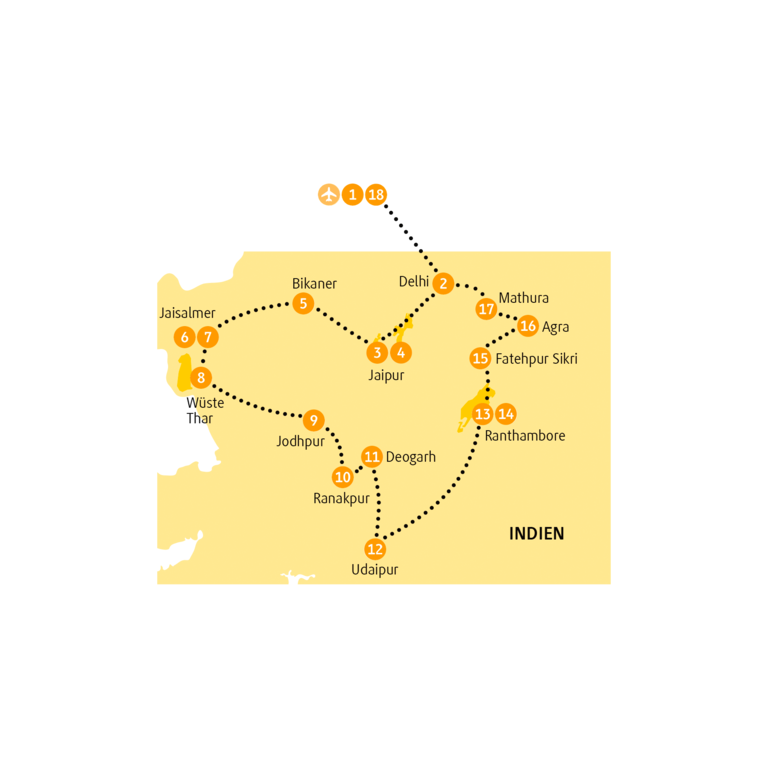 Eine blaue Stadt, eine rosa Stadt, eine goldene Stadt. Zur Abwechslung das Rote Fort der Maharadschas und sehr viel Weiß im Venedig des Ostens. Dazu die silberne Nacht im Wüstencamp der mondscheinhellen Thar und das schönste Bauwerk der Menschheit, nach dem diese Reise benannt ist: das Taj Mahal, Zeugnis einer unvergänglichen Liebe. Die mit Edelsteinen besetzte Vergangenheit ist dir sicher. Nur die Tiger im Ranthambore-Nationalpark wollen und wollen mal nicht.