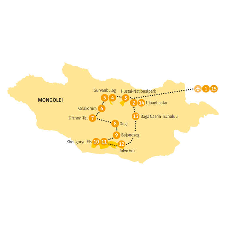 <Auf dem Weg gen Westen in die zentrale Region der Mongolei besuchst du die Ruinen der Festung Khar Bukh Balgas, die ein Zeugnis des Kidan-Reichs aus dem 10. bis 12. Jahrhundert ist. Du fährst weiter nach Gurvanbulag, eine Gegend in der Wald, Berge, einsame Steppen und die Sanddünen der Wüste Gobi zusammentreffen. Dieses einzigartige Gebiet gehört zum Khogno-Khan-Naturreservat. Hier besuchst du eine Nomadenfamilie und übernachtest in einem Jurtencamp, das zu einer Nomadengemeinde gehört. Auf diese Weise kommst du in unmittelbaren Kontakt mit den Bewohnerinnen und Bewohnern und erhältst gleichzeitig tiefe Einblicke in deren Kultur und Alltag. Sei nicht scheu und frage, was du über das Nomadentum wissen möchtest – die Gastfreundschaft und fröhliche Lebensweise der Nomadinnen und Nomaden wird dich begeistern. -