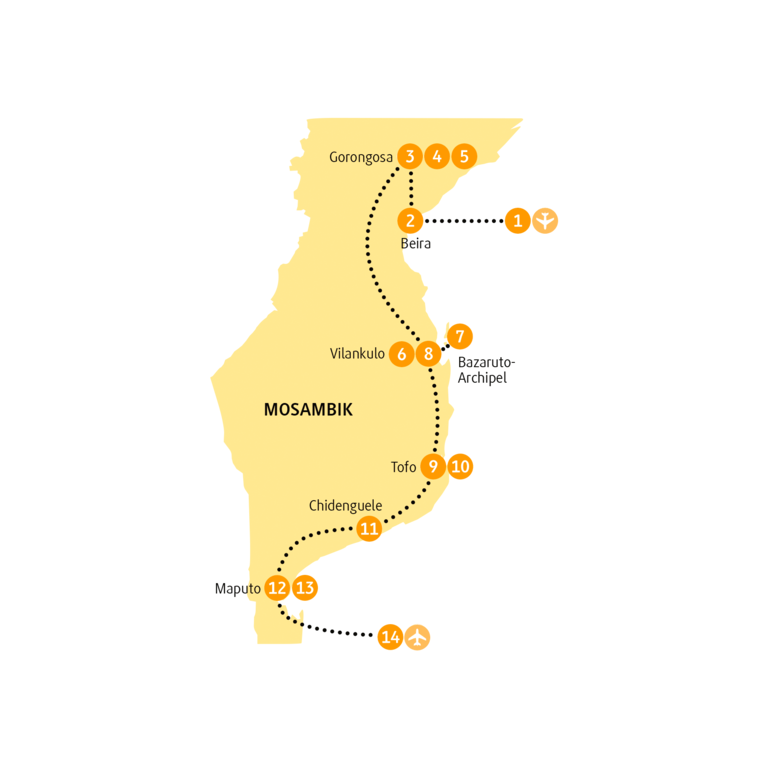 <Heute und in den kommenden Tagen steht bereits ein großes Highlight deiner Reise auf dem Programm, wie von National Geographic als »Africa’s Lost Eden« betitelt: Wir fahren zum Gorongosa-Nationalpark. Auf holpriger Straße geht es landeinwärts in nördliche Richtung. »Afrikanische Massage« nennt sich das. Der Park liegt im Herzen von Zentralmosambik am südlichen Ende des Großen Afrikanischen Grabenbruchs. Er ist etwa 3.770 Quadratkilometer groß und besteht aus typischer Buschlandschaft, Flusstälern, Hochebenen und Bergen, die mit tropischem Regenwald bewachsen sind. Gorongosa beheimatet eine erstaunliche Vielfalt an Tieren und Pflanzen, von denen einige endemisch und somit sonst nirgendwo auf der Welt zu finden sind. Ein Hotspot auf der Wanderroute von Zugvögeln. Viele der Tierbestände des Parks wurden durch jahrzehntelange Bürgerkriege und Wilderei stark reduziert. Dank effektiven Parkmanagements und der Wiederansiedlung wichtiger Arten sind die Wildtierpopulationen heute zurück auf dem natürlichen Niveau und man kann den Park in seiner ursprünglichen Pracht erleben. Nach der Ankunft in Chitengo erwartet dich am Nachmittag auch schon die erste dreistündige Safari im offenen Geländewagen. In Abhängigkeit von der Teilnehmerzahl sind außer dir ggf. auch andere internationale Gäste auf den Safarifahrten im Gorongosa-Nationalpark. -