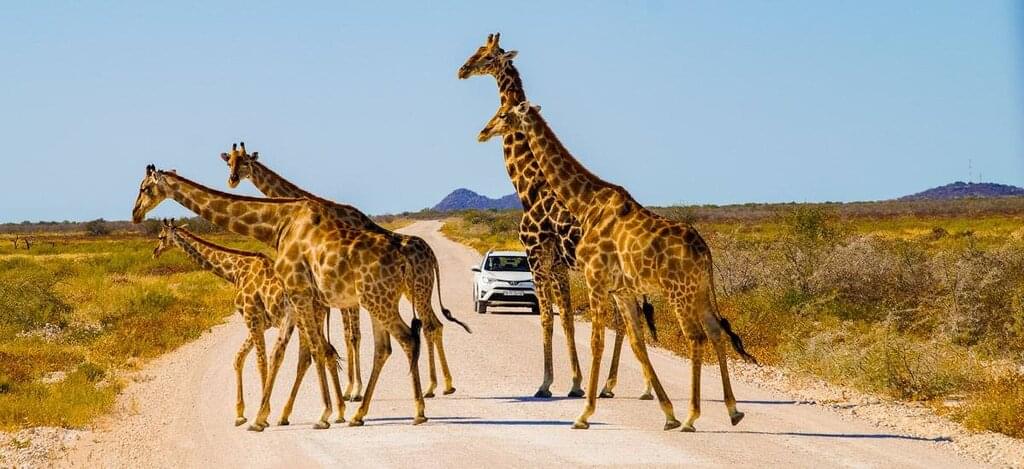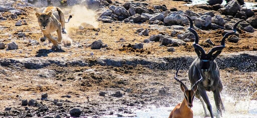 - 3 Safaris im Etosha-NP und 1 Safari im Bwabwata-NP; 4 Safaris im offenen Geländewagen: im Chobe-NP, im Moremi-Wildreservat und 2 im Wildpark der Okapuka Safari Lodge; 2 Safaris per Boot: auf dem Okavango und im Chobe-NP
