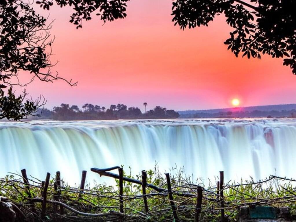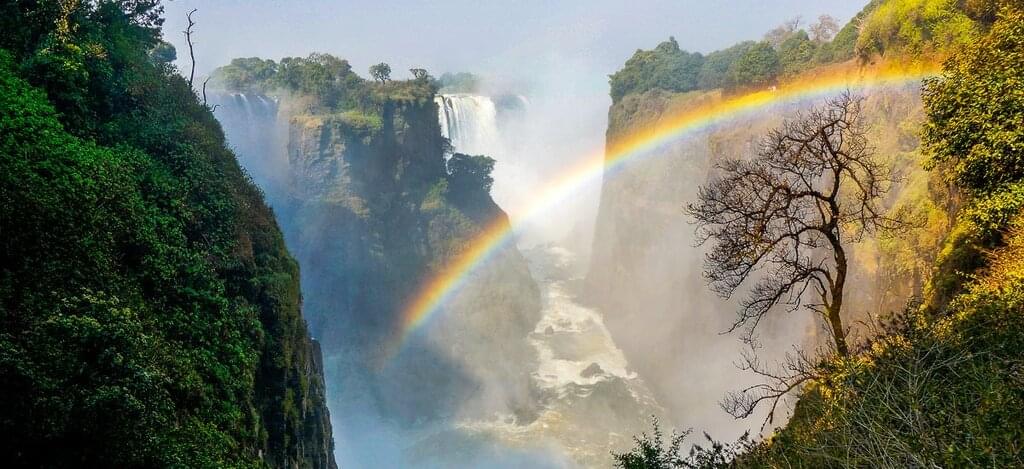Es geht direkt los mit einem von vielen Highlights deiner Reise. Du besuchst die berühmten Victoriafälle und beobachtest, wie der Sambesi sich mit tosendem Lärm über 100 Meter in die Tiefe stürzt. Auf einem Rundwanderweg eröffnen sich dir immer wieder neue Perspektiven und Fotomotive. Der Wassersprühnebel steigt bis zu 200 Meter in die Höhe und ist noch in weiter Entfernung zu sehen, weshalb die Wasserfälle von den Einheimischen Mosi-oa-Tunya genannt werden, was so viel wie »donnernder Rauch« bedeutet. Das UNESCO-Weltnaturerbe ist umgeben von tropischem Regenwald, ein wahres Naturparadies, das durch die Feuchtigkeit der immerwährenden Gischt existieren kann.