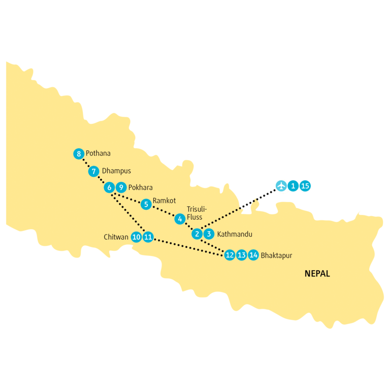 <Namaste! Willkommen in Nepal. Das sogenannte »Dach der Welt« erwartet dich. Riesige schneebedeckte Berge, eiskalte türkisfarbene Seen, entlegene kleine Dörfer, geheimnisvolle Tempel und unglaubliche Gastgeber: Das ist Nepal – deine Spielwiese für die kommenden zwei Wochen. Nach deiner Landung in Kathmandu wartet ein Fahrer auf dich, der dich zum Hotel bringt. Am Nachmittag wartet schon der Guide in der Hotellobby, um dir und den anderen Reiseteilnehmern die ersten Infos zur Tour zu geben. Zuallererst fahrt Ihr zu einer einheimischen Familie, die schon sehr gespannt darauf ist, euch kennenzulernen. Vor dem gemeinsamen Abendessen lernst du zwei Bewohner*innen aus dem »Pabitra Sozialhaus« kennen. Dort kümmern sich die Helfer seit knapp 20 Jahren um Kinder, Jugendliche, Senioren und Menschen mit Behinderungen aus Kathmandu und den umliegenden Dörfern. Im Anschluss werdet ihr mit selbstgemachten lokalen Köstlichkeiten verwöhnt und erfahrt spannende Geschichten aus dem Alltag der Familie. Ein aufregender Start in dein Nepal-Abenteuer. Wichtig: Dein Hotelzimmer ist wie überall auf der Welt gegen 14 Uhr bezugsfertig. Falls du dein Zimmer schon früher beziehen möchtest, buchen wir gern ein Tageszimmer für dich. Frag uns einfach -