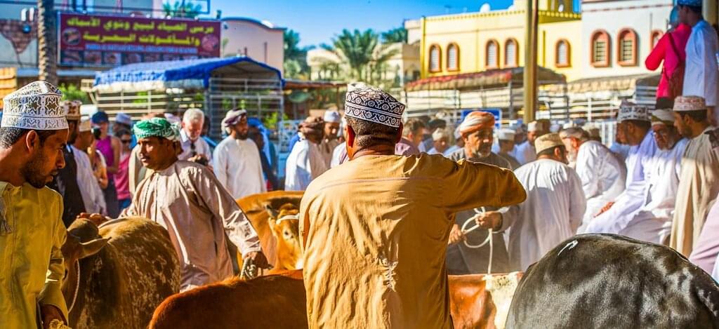 <Wenn man sich etwas einliest, fällt man schnell über die wörtliche Bedeutung des Wortes Maskat: »Ort des Fallens«, was von den steil ins Meer abfallenden Bergen oder der Nutzung als Ankerplatz abgeleitet werden kann. Wie dem auch sei, das Meer und der Seehandel haben für das Land schon immer eine wichtige Rolle gespielt. Viele Küstenbewohner leben noch heute vom Fischfang. Es heißt also gespannt sein, welche exotischen Wasserbewohner uns auf dem Fischmarkt in Seeb unter die Augen kommen. In einer großen Markthalle am Hafen verkaufen die Fischer und Fischerinnen ihre fangfrische Ware. Fürs Erste verabschieden wir uns dann von der Küste und machen uns auf den Weg ins Hadschar-Gebirge. Unser nächster Halt gilt der malerischen Oase Birkat Al-Mauz. Übersetzt bedeutet der Name »See der Bananen«, angesichts der weitläufigen Gärten ein treffender Name. Die meisten Gebäude entlang der Straße sind neu, die alten Ortsteile aus Lehm wurden größtenteils aufgegeben und liegen gut versteckt im Palmenhain und oberhalb der Oase auf einem hohen Felsen. Wir vertreten uns unter den schattigen Palmwedeln einen Augenblick die Beine und kehren für einen traditionellen Kaffee ein. Frisch gestärkt schlängeln wir uns die Bergstraße hinauf zum Jabal Akhdar oder auch »Grüner Berg«. Von unserer Unterkunft haben wir eine atemberaubende Panoramaaussicht. Bei Sonnenuntergang den Blick über den Canyon schweifen lassen und die frische Bergluft aufsaugen – das berührt! Und wir fragen uns, wie wir jemals wieder im Gewusel unseres Alltags ankommen können. Statt im Reiseminibus sind wir an den Tagen 3 bis 9 in Allrad-Geländewagen unterwegs. Pro Auto sind 4 Gäste geplant. Eine Person neben der Fahrerin oder dem Fahrer und drei in der mittleren Reihe. Dahinter gibt es genügend Platz für Koffer und Rucksäcke. -