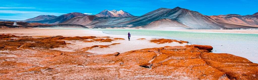 <Wüste, Mondtal und Geysire: Dein Panorama für die nächsten Tage. Du fliegst nach Calama und dann geht es dorthin, wo du wirklich hinwillst: In das charmante Wüstendorf San Pedro de Atacama. Wüstenflair, Brauntöne in allen Schattierungen kombinieren sich hier aufs Vorzüglichste mit netten Cafes, Kneipen, Restaurants und kleinen Geschäften, wo du das eine oder andere Kunsthandwerk erwerben kannst. Vor der Abenddämmerung fährst du ins Valle de la Luna, das Mondtal, um den Sonnenuntergang in dieser bizarren mondähnlichen Landschaft mit ihren leuchtenden Farben zu erleben. Im Mondtal wird es nachmittags oft sehr windig und kühl. Wir empfehlen dir daher, lange Kleidung mitzunehmen. In den Monaten April bis September kann es zu leichten Programmanpassungen kommen, da die Sonne früher unter geht. -