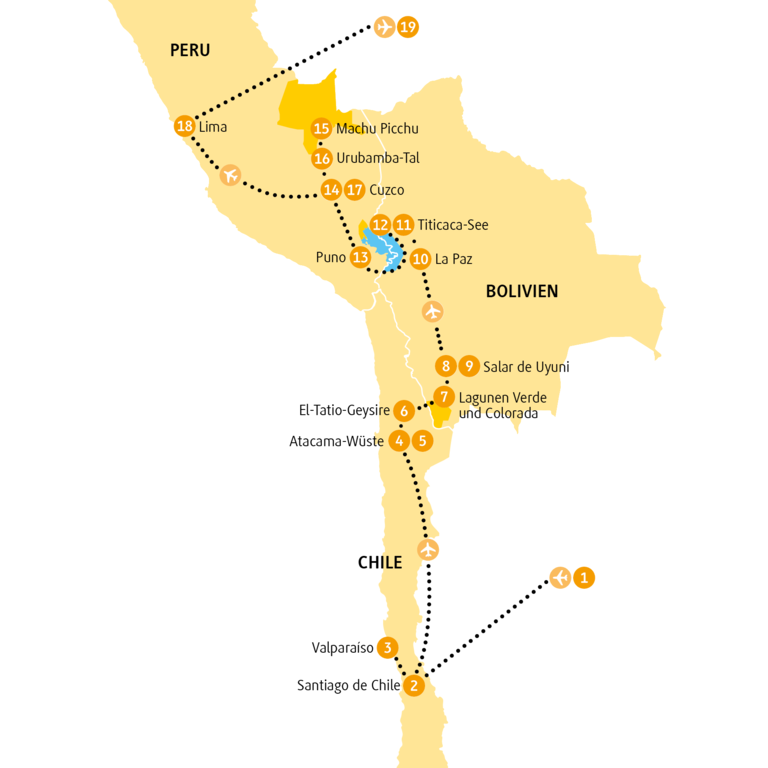 Natürlich platzen sie von Historie und Lebensfreude aus allen Nähten: Santiago de Chile, Valparaíso, Cuzco und Lima. Aber was die Natur dagegengesetzt hat, ist noch hundertmal berauschender: Die Salar de Atacama. Die Geysire von El Tatio. Die Lagunen Verde und Colorada. Den Salzsee Salar der Uyuni. Den Titicaca-See. Und wenn du nach all diesen bewegenden Momenten kaum noch weißt, wo dir der Kopf steht, kommt Machu Picchu. Das Wunder.