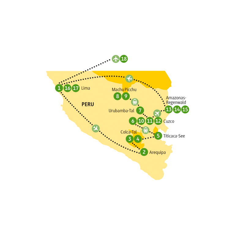 <Verabschiede dich vorerst von der »Stadt der Könige«, denn ein Highlight dieser Reise steht dir bevor. Am Morgen hebt ihr Flieger nach Arequipa ab, dessen historisches Zentrum zum UNESCO-Weltkulturerbe zählt. Der spanische Einfluss auf die Architektur wird beim Anblick der wunderschönen Kathedrale und der Jesuitenkirche La Compañía deutlich. Lass es dir schmecken! Fülle deine Energiereserven für eine kurze Erkundungstour durch die »weiße Stadt«. Nachmittags besuchst du das Kloster Santa Catalina. Es stellt das bedeutendste Beispiel der Kolonialarchitektur des 16. Jahrhunderts dar. Nimm Einblick in das streng religiöse Leben dieser Zeit. Anschließend bleibt noch etwas Zeit, den Gemüse- und Obstmarkt San Camilo in der Altstadt zu besuchen und verschiedene exotische Früchte zu probieren. Der Flugplan für den Inlandsflug von Lima nach Arequipa wird dir von unserem Partner vor Ort ausgehändigt. -
