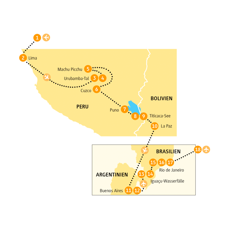 <Endlich ist es so weit, auf ins ferne Südamerika. Über Nacht geht es mit dem Flieger nach Lima, in die quirlige Hauptstadt Perus. Bist du bereit die Welt der Inka zu entdecken, am Titicaca-See zu übernachten, die Gischt der atemberaubenden Iguaçu-Fälle im Gesicht zu spüren und das pulsierende Leben in Rio zu erleben? -