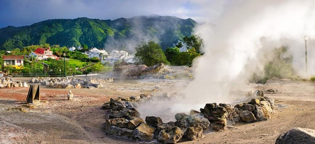 <Nach einem leckeren Frühstück bist du bereit, die Insel kennenzulernen. Von Ponta Delgada geht die Fahrt entlang der Südküste nach Furnas. Hier wanderst du entspannt einmal um den gleichnamigen See und endest bei Warmwasserquellen, die mit einer Temperatur von bis zu 98 Grad aus der Erde sprudeln. Diese Geothermalenergie wird seit langer Zeit genutzt, um das traditionelle Gericht Cozido das Furnas zu kochen. Du darfst hierbei nicht nur zuschauen, sondern beim anschließenden Mittagessen Cozido natürlich auch probieren. Der nahe gelegene botanische Garten »Terra Nostra« eignet sich hervorragend für einen Spaziergang entlang der Pflanzenpracht. Inmitten des Gartens wartet ein besonderes Erlebnis. Das Wasser der heißen Quellen wird hier in einem Schwimmbad gesammelt, also hüpf rein und genieße das wohltuende Wasser. Es geht weiter entlang der Nordküste bis zur Teeplantage Chá Gorreana. Sie ist die älteste und letzte Plantage ihrer Art in Europa und wird seit 1883 familiengeführt. Erlebe einen kleinen Rundgang, bei dem du Interessantes zur Teeherstellung erfährst. Den Abend kannst du entspannt in Ponta Delgada ausklingen lassen. Vergiss nicht, deine Badesachen ins Handgepäck zu packen, damit du die schöne Bademöglichkeit auch wirklich nutzen kannst. Bitte beachte, dass das braune eisenhaltige Wasser helle Badekleidung einfärben kann und trage lieber dunkle Stoffe. -