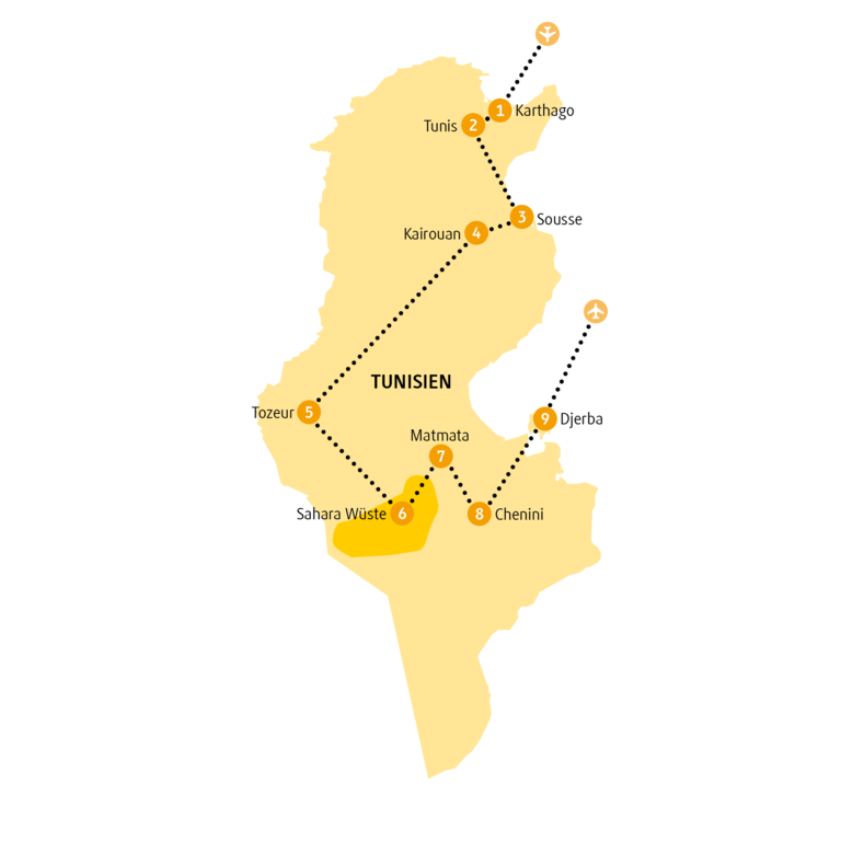 <Nach deiner Ankunft am Flughafen Tunis wirst du von deiner Reiseleitung herzlich empfangen. Anschließend lässt du den Tag bei einem gemeinsamen Abendessen entspannt ausklingen. Saha – Guten Appetit! Sollte der Gruppenflug in Tunis so landen, dass du das Abendessen am ersten Tag nicht mehr schaffst, holen wir es am zweiten Tag nach. -