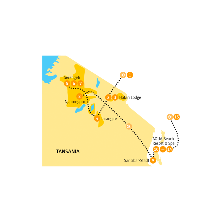 Es passiert nicht oft, dass du einen Urlaub buchst und drei bekommst. In Tansania geht das: Einen für unsere Safaris im Tarangire-Nationalpark, im Weltnaturerbe Serengeti und im Ngorongoro-Krater, der Heimat von 25.000 Tieren. Einen für die mondscheinhellen Nächte in den Camps der Wildnis, die auch nachts nicht schläft. Und einen dritten, der gepfeffert ist: Am schönsten, kuschelwarmen Sandplatz der Gewürzinsel Sansibar: Verwöhnt unter Palmen im AQUA Beach Resort & Spa.